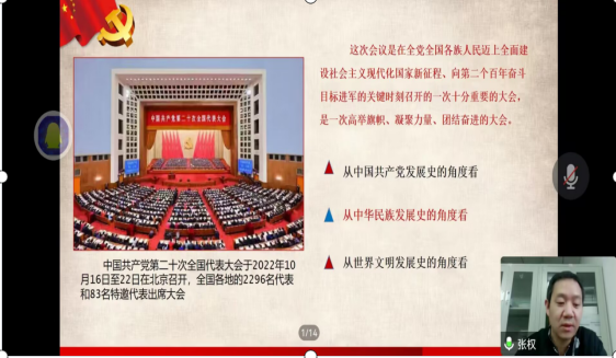 通过党委委员宣讲、支部书记领学、党日活动、主题班会等形式在全院范围内展开学习,推动党的二十大精神入脑入心,见行见效。2022年12月1-12月8日学院党委委员分别为各自联系的师生党支部开展了“学习贯彻二十大精神”专题宣讲活动。