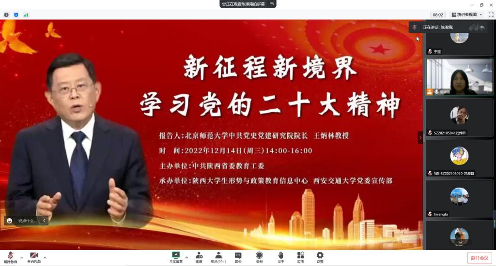 2022年12月14日下午,院党委组织全院师生党员在西安交通大学思源直播平台”上线上聆听了北京师范大学中共党史党建研究院院长王炳林教授作题为新征程新境界学习党的二十大精神”报告会。