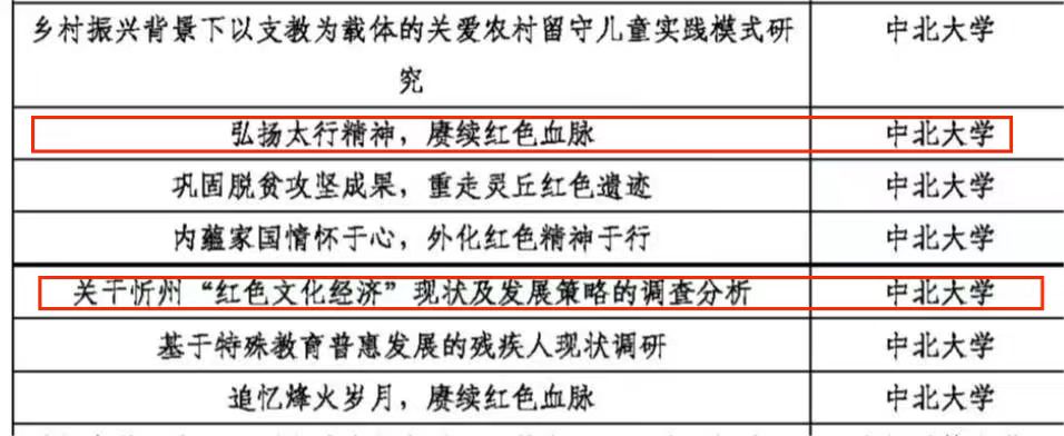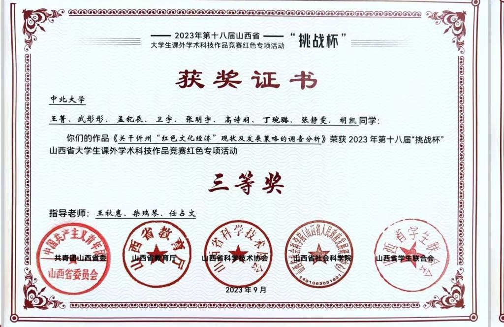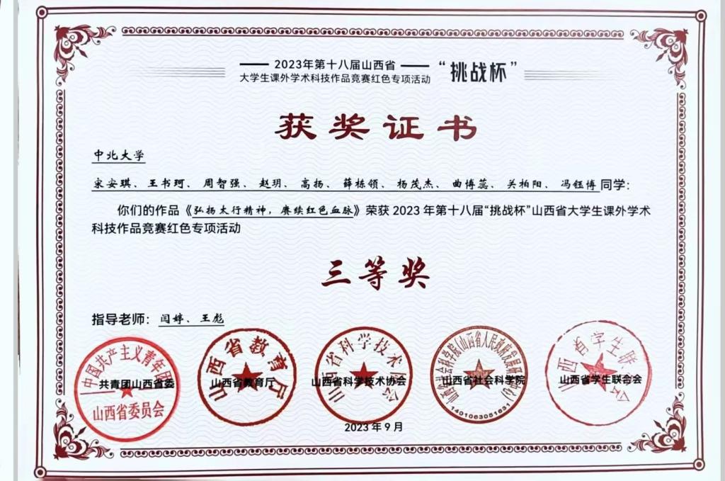 学生组成的“中北大学表里山河”团队(指导老师:王秋惠、柴瑞琴、任占文)和“弘扬太行精神,赓续红色血脉”团队(指导教师:闫婷、王彪)在“红色专项”活动中均获得省级三等奖,并晋级国赛项目。