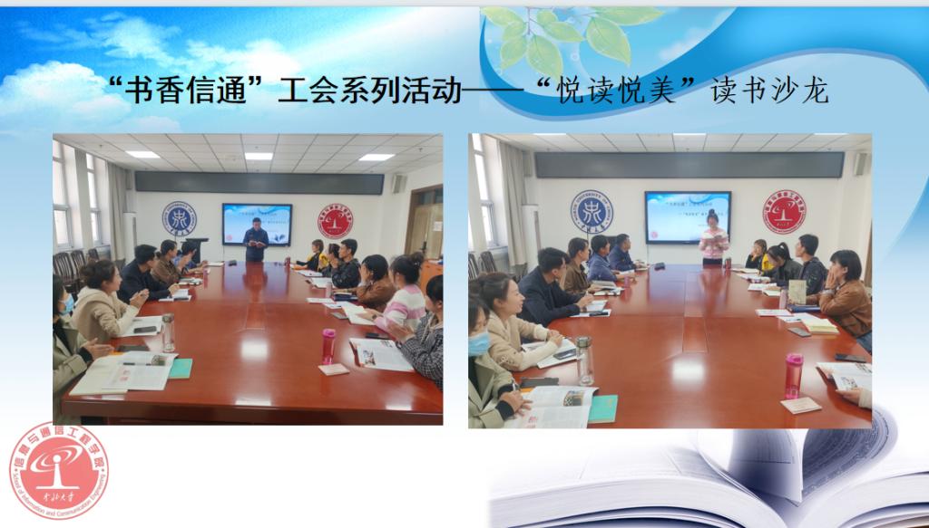 “书香信通”读书系列活动,包括“悦读悦美”好书推荐和“悦读悦美”读书沙龙。在沙龙中各位教师来到现场一同分享喜爱的书籍。现场,大家积极分享,气氛热烈。在读书交流中,大家依次分享了自己喜爱的书籍,与经典同行,为生命阅读。他们或充满激情、或娓娓道来,结合各自的工作生活经历和切身体会,畅谈自己的感悟,并与在场人员交流分享阅读心得,在分享中汲取精神力量,弘扬红色传统、传承红色基因。