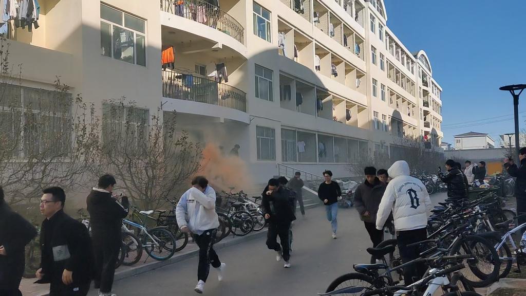 下午14时05分,消防应急疏散逃生演练正式开始,模拟“火情”出现,班级安全员发现火情,第一时间向总调度报告,急促的防空警铃响起,参演辅导员及学生骨干、班级安全员按照演习预案,引导学生有序撤离到应急避难场所,等待救援力量赶往现场。从发现“火情”到全部同学安全撤离到应急避难场所,整个过程用时2分50秒。