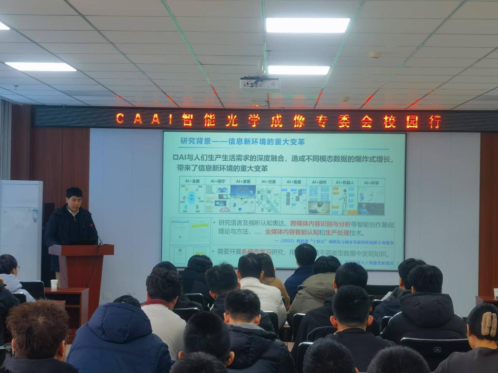 在科学楼B座715学术报告厅成功举办了中国人工智能学会(CAAI)智能光学成像专委会校园行相关活动。本次活动邀请清华大学软件学院丁贵广教授和中科院计算所李亮研究员开展了两场学术讲座,主题分别为《深度学习模型压缩加速技术》和《跨模态细粒度理解与生成》,讲座由副院长刘吉主持,院长陈平出席,学院广大教师和研究生积极参与了此次讲座。
