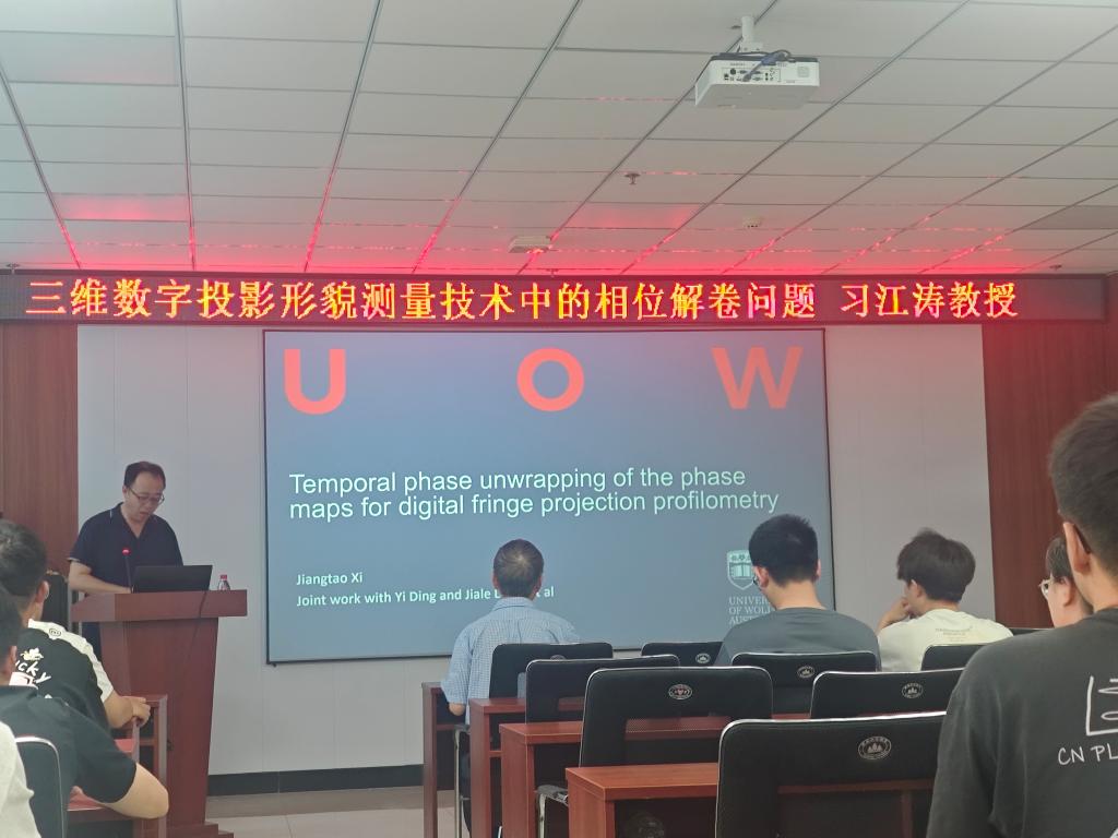 在科学楼B座715会议室成功举办了研究生第20250504期华彩讲坛。学院邀请澳大利亚伍伦贡大学工程与信息科学学部副部长习江涛教授主讲,题为《三维数字投影形貌测量技术中的相位解卷问题》,讲座由孙豫峰书记主持,学院广大教师和研究生积极参与了此次讲座。