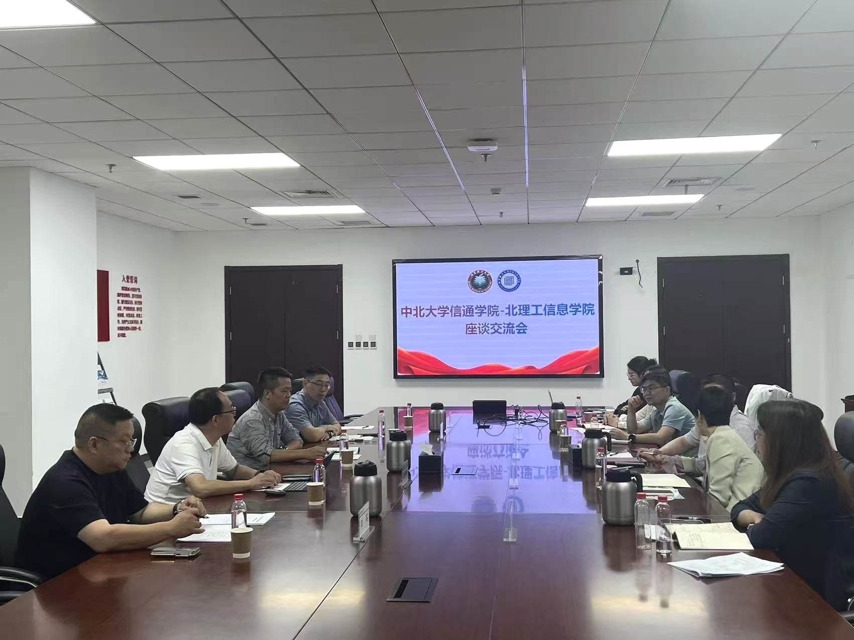 到访表示了热烈欢迎。院长忻向军和王黎明分别介绍了双方学校和学院的基本情况,王黎明院长表明了此次访问的核心需求。随后双方聚焦议题,重点围绕推免生选拔标准交换经验,针对信息领域需求探讨了科研合作的途径,并分享了博士引育、柔性引才的管理经验。同时,双方就党建工作、本科专业认证等方面也进行了广泛交流。