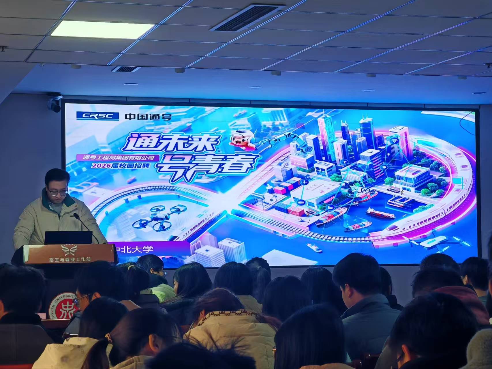 在11号楼7层报告厅成功举办中国通号工程局集团2026届专场招聘会。通号工程局集团与中北大学有着多年深厚合作渊源,此次招聘会既是双方校企合作的集中展示,更是学院为学子搭建优质就业桥梁、精准对接岗位需求的关键举措。招聘会吸引百余名电子信息工程、通信工程、轨道交通信号与控制、自动化等专业应届毕业生到场参会,互动咨询环节气氛热烈。