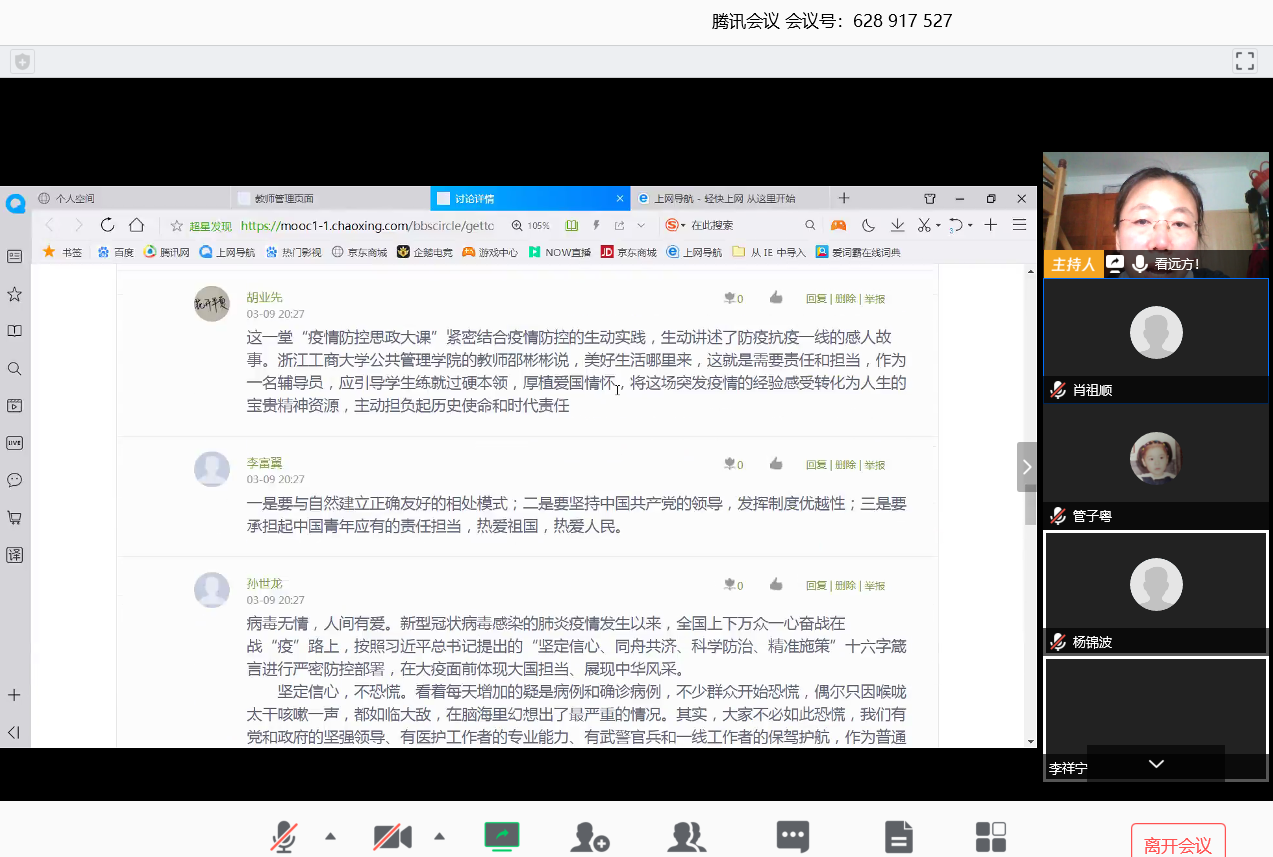 截止现在,全院本科班级通过腾讯会议、钉钉直播、QQ直播、QQ课堂等形式共计开展35场线上主题班会,受众人数达3000余人,分别邀请到校内教师,疫情防控医务工作者、社区人员等担任主讲人。各班级围绕疫情防控专题、理想信念教育,爱国主义教育,战“疫”中成长、“全国大学生同上一堂疫情防控思政大课”之大讨论、宅家抗“疫”思考等专题向同学们科普新冠肺炎防控知识、讲述在这场没有硝烟的战斗中逆行英雄们的典型事迹,进行生命与健康教育,引导同学们要热爱自然、敬畏生命、尊重规则,懂得爱与责任。