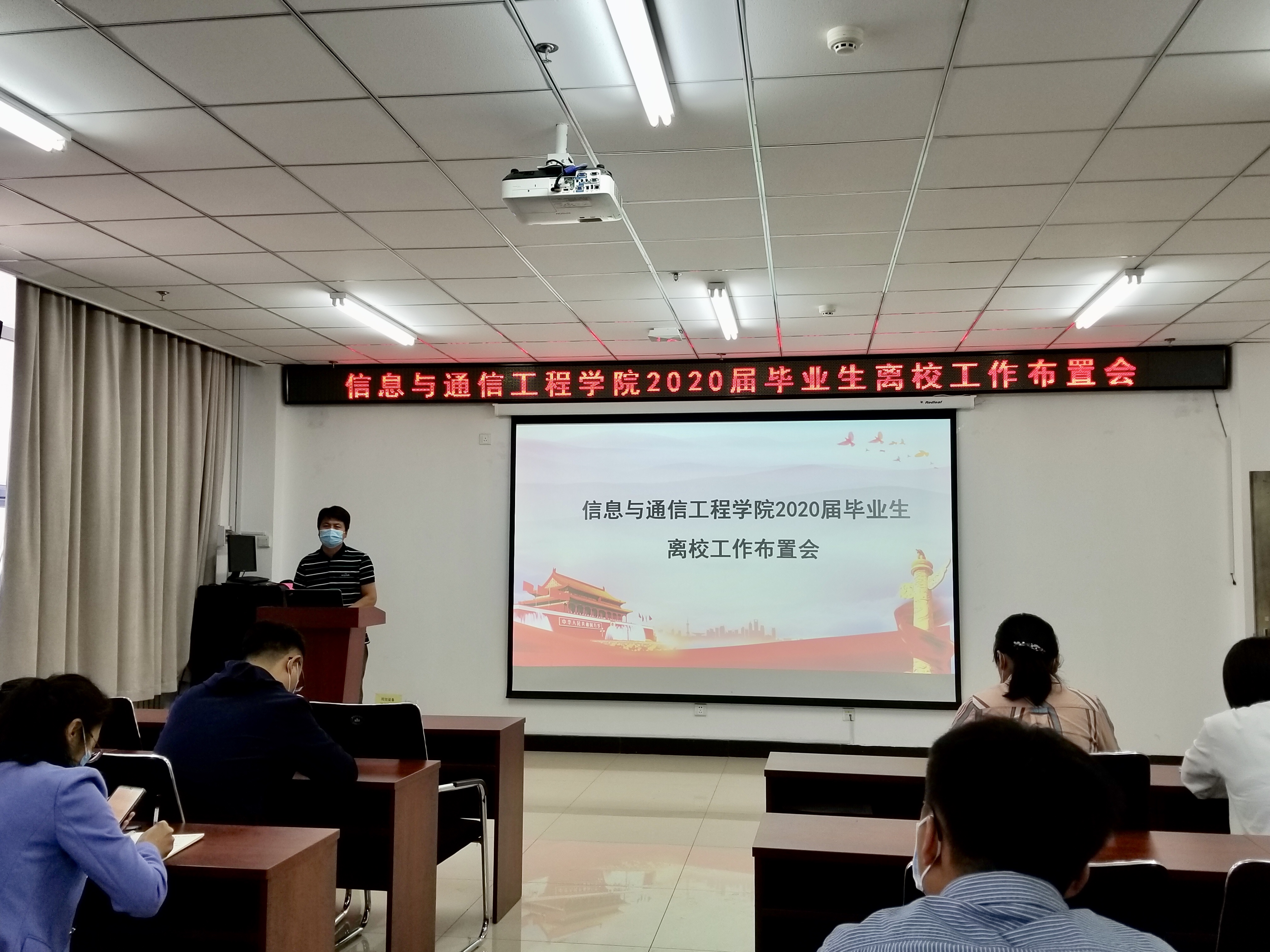 党委书记曹凤才、党委副书记魏媛媛、全体毕业班班主任和班长在科学楼715会议室召开了2020届本科毕业生离校工作部署会,会议由学生科张永玲老师主持。