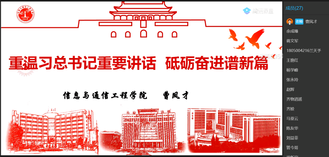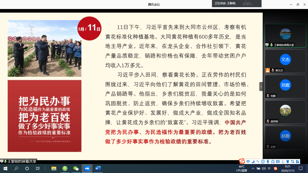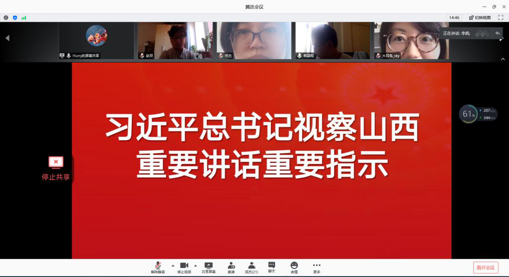 领学活动中,党委委员们以“重温习近平总书记重要讲话,砥砺奋进谱新篇”为主题,带领全院全体师生党员重温了习近平总书记视察山西的足迹和讲话,并结合自身感受习近平总书记重要讲话精神对我们工作、学习、实践的指导作用。通过领学,学院师生党员对习近平总书记视察山西的讲话精神和重要指示有了更深、更细的认识和理解,深刻体会到习近平总书记对山西的关心和关怀,为深刻学习领会习近平总书记重要讲话重要指示提供了科学的学习方法。党委委员们要求学院党员师生要牢记总书记的殷殷嘱托,坚持不懈抓好党内政治生态建设,加强理想信念教育,并要求全体党员同志发挥先锋模范作用,抓住省委支持学校率先发展的机遇,克服新冠肺炎疫情带来的不利影响,不忘初心,砥砺奋进,牢牢扛起攀登科学高峰的使命;牢牢扛起为转型发展提供科技支撑的使命,立足服务山西转型发展大局,着力科研成果转化和产业化,打造转型发展竞争新优势;牢牢扛起打造一流人才高地的使命,建设一流学科;牢牢扛起立德树人、培养人才大军的使命,立足山西、面向未来,深化教育教学改革,更好服务高质量转型发展。只争朝夕乘势而上,为实现8X8X