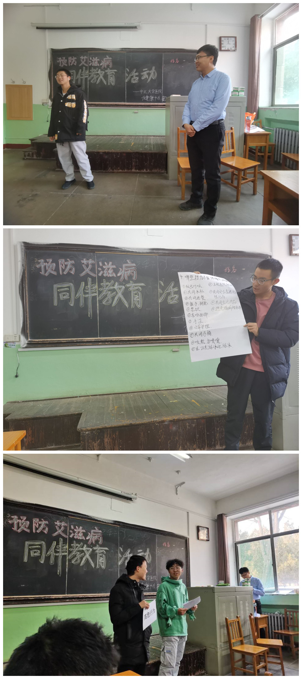 在校医院赵海滨医生的组织下,学院派出两名同学参加预防艾滋病同伴教育活动。作为防艾志愿宣传员,同学们在活动结束后在学院宿舍内积极宣传防艾知识,让艾滋病预防进基层宿舍,由点及面进行普及。