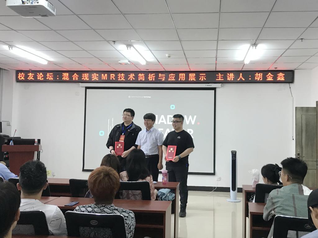 胡金鑫校友首先简单介绍了影创科技集团的创立初衷及公司文化,并欢迎学弟学妹去上海影创科技集团参观体验。接下来针对虚拟现实进行了简单的介绍和市场分析。论坛分享了影创科技公司AR、VR、MR技术目前在科技、文化、旅游、教育、娱乐、电子竞技等领域的应用及相应的产品,并对全息影像技术原理进行了详细的阐述说明,最后,曹凤才书记为胡金鑫校友和刘晖校友颁发了校友导师聘书,期待校友联动,为学院育人工作提供指导。