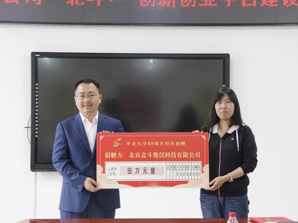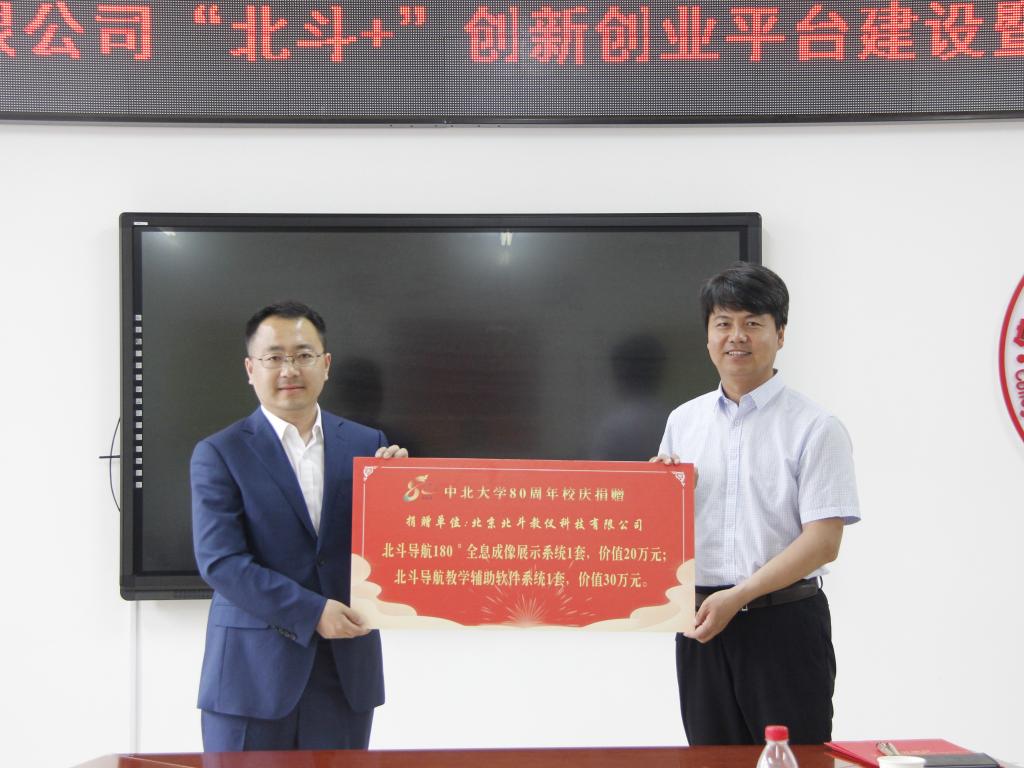 捐赠仪式上,北斗教仪捐赠价值20万元的北斗导航180°全息成像展示系统1套和价值30万元的北斗导航教学辅助软件系统1套,用于学校“北斗+”创新创业平台建设;捐赠人民币伍万元,用于信息对抗专项奖学金项目。院党委副书记兼副院长魏媛媛、副院长赵冬娥分别与企业签署捐赠协议。院党委书记曹凤才、副院长赵冬娥作为代表接受捐赠。