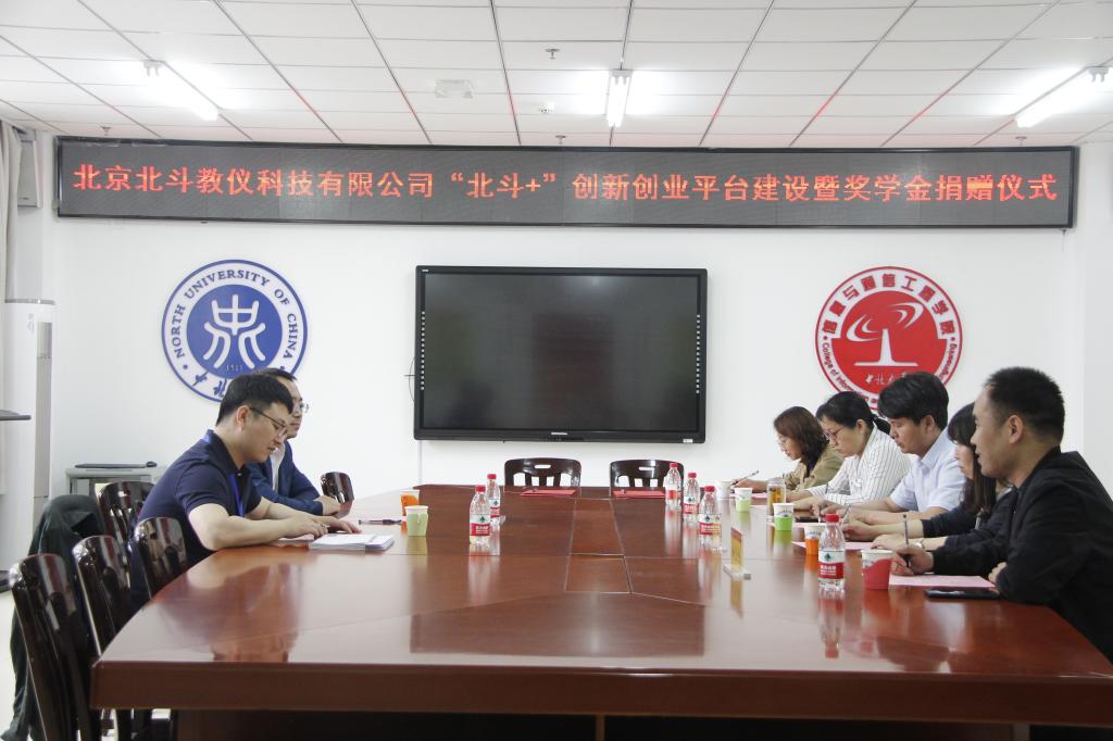 在院楼713会议室成功举办了北京北斗教仪科技有限公司“北斗+”创新创业平台建设暨奖学金捐赠仪式。北京北斗教仪科技有限公司总经理苏彪、副总经理黄磊、8X8X
