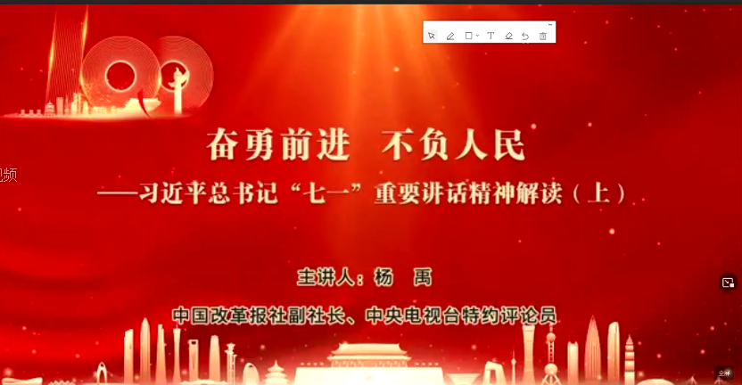 央视特约评论员杨禹老师《奋勇前进 不负人民——习近平总书记“七一”重要讲话精神解读》为题,从横向理论经验总结到纵向百年大党发展历程,深入浅出地梳理了习近平总书记“七一”重要讲话全文。带大家回顾了中国共产党为实现中华民族伟大复兴的奋斗史;分析了习近平总书记围绕“以史为鉴,开创未来”提出的“九个必须”;解读了习近平总书记对全体中国共产党党员发出的新号召。