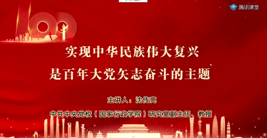 国家行政学院研究室副主任沈传亮教授《实现中华民族伟大复兴是百年大党矢志奋斗的主题》为题,从“实现中华民族伟大复兴是党奋斗百年的主题”、“推进中华民族伟大复兴征程上取得的四个伟大成就”、“推进中华民族伟大复兴取得伟大成就的珍贵启示”三个方面帮助大家进一步领会了习近平总书记在庆祝中国共产党成立100周年大会上的重要讲话精神,激励广大党员干部立足现实,运用好党的历史经验,把牢正确方向,做好当下的事情,为实现中华民族伟大复兴而不懈奋斗。