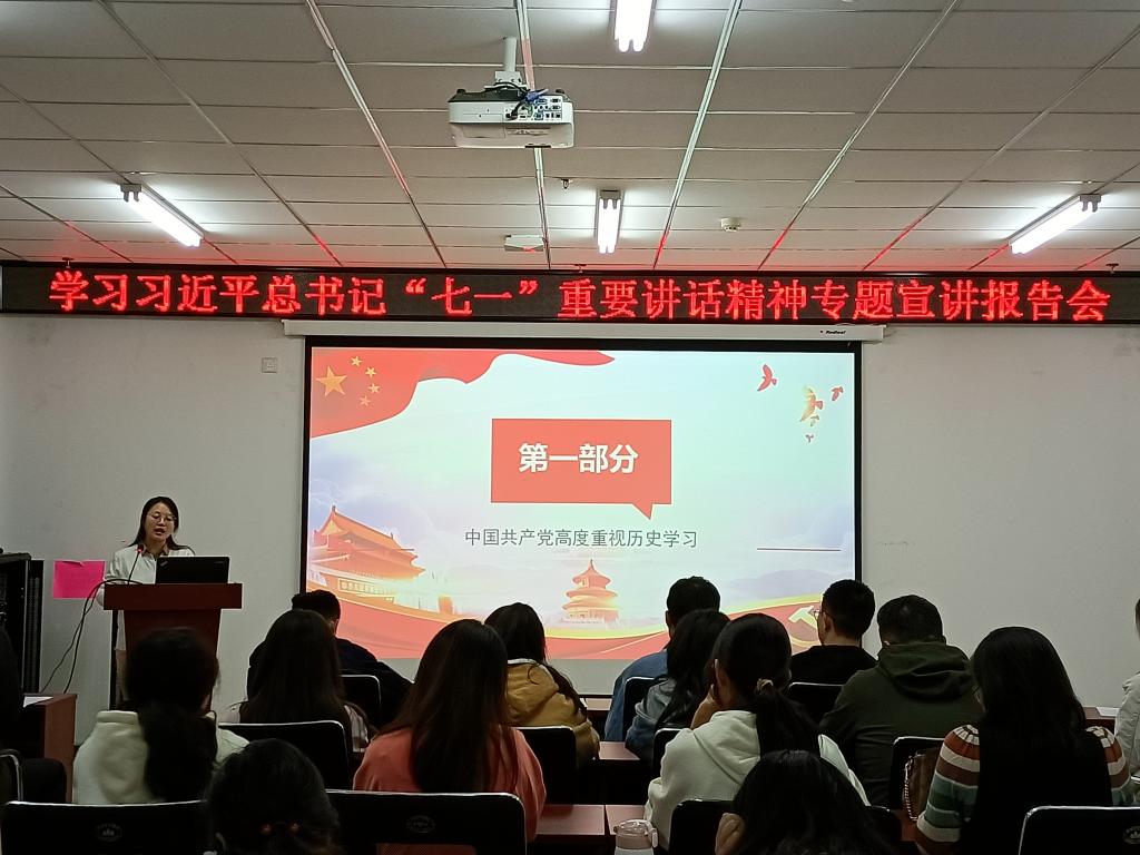 党委开展了学习习近平总书记“七一”重要讲话精神专题宣讲活动,邀请校党史学习教育宣讲团成员、马克思主义学院张慧玲老师作题为《从“七一”讲话看中国共产党人的历史观》的专题讲座,全体师生党员参加了学习。