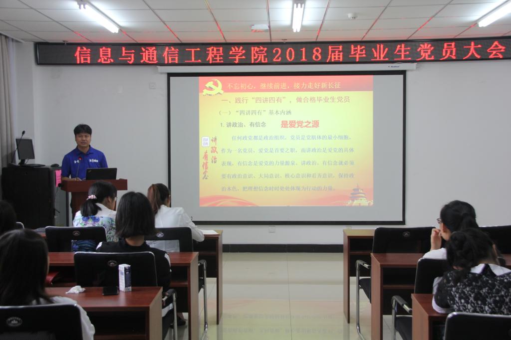 接着,院党委曹凤才书记做了《不忘初心,继续前行,接力走好新长征》的微党课,希望同学们践行“四讲四有”,做合格毕业生党员;牢记“四个意识”,把爱党、忧党、兴党、护党落到工作生活各个环节。曹书记对全体毕业生党员提出两点希望:一是要加强党性修养,深化对十九大精神的学习;二是希望青年学生“爱国、励志、求真、力行”,在日后的工作和生活中肩负起党员的责任,以最好的精神状态和工作业绩迎接新的生活。