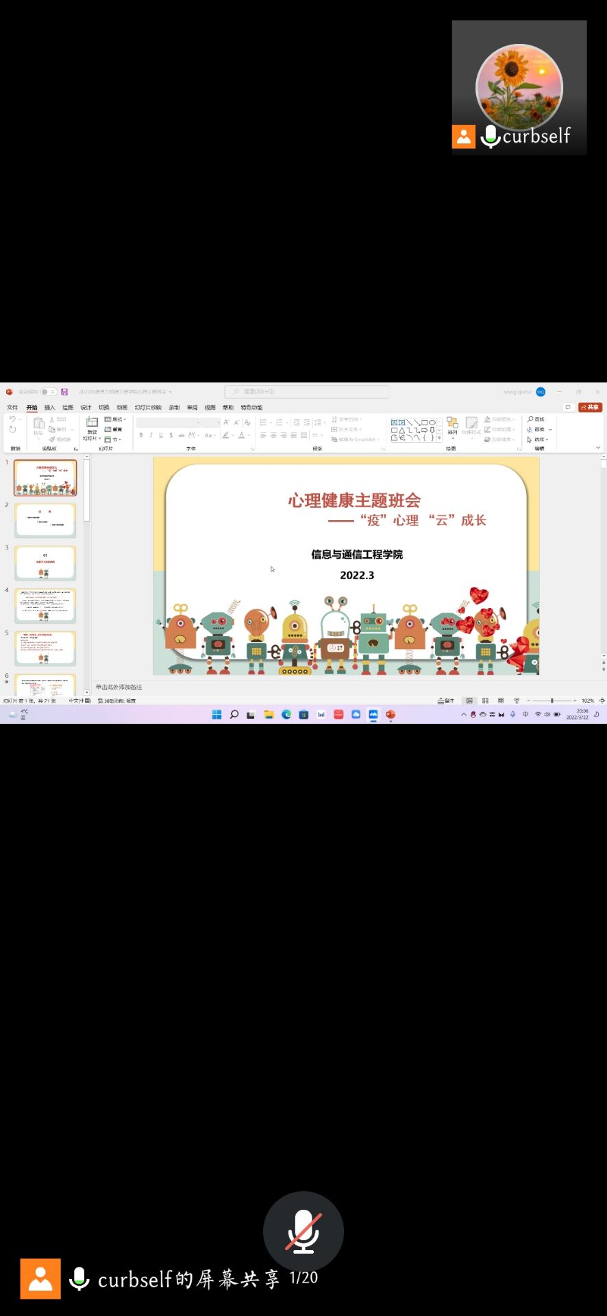为进一步做好疫情防控背景下学生的心理问题疏导和帮扶工作,提高学生的心理调节能力,培养良好的心理品质,以积极心态科学应对疫情,4月中旬,学院面向本科生各班级开展““疫”路同行,守护心理健康”和““疫”心理 “云”成长”心理健康教育主题班会。此次心理健康教育主题班会的召开,有助于同学们养成积极乐观的心态,更有利于当前形势下8X8X 学生心理健康教育工作的进一步开展,促进了学生身心健康和谐发展,营造了和谐健康的校园文化氛围。