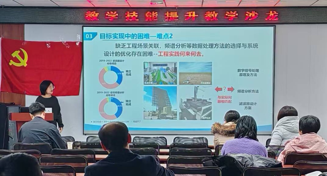 王玉老师在第五届全国高校教师教学创新大赛中,她凭借课程设计的创新性、兵工应用的前沿性以及教学成效的显著性,荣获山西省一等奖和全国三等奖。此外,她在第七届全国高等学校电子信息类专业青年教师授课竞赛中斩获华北赛区一等奖。会上,王玉老师以《数字信号处理》课程教学为例,分享了如何将兵工学科特色与数字技术深度融合,打造“来去有踪”的教学新模式。她强调,教学创新需以学生为中心,通过虚拟仿真实验、项目驱动学习等方式,将抽象的信号处理知识转化为可感知、可追踪的实践过程。