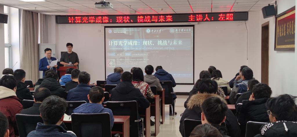 在报告中,左超教授首先为大家介绍了“计算光学成像”这一新兴交叉研究领域的基本概念,重点将前端物理域的光学调控与后端数字域的信息处理有机结合,为突破传统成像技术的诸多限制性因素提供了新思路;然后介绍了南京理工大学智能计算成像实验室在此领域的最新研究进展,并展望其未来发展方向及其核心赋能技术—人工智能与深度学习;最后,在座师生与左超教授针对相关学术问题进行了深入的探讨和交流。