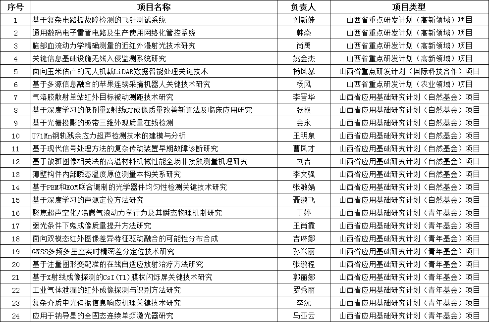 有24位教师获得项目资助,其中山西省重点研发计划(国际科技合作)项目1项、山西省重点研发计划(高新领域)项目4项、山西省重点研发计划(农业领域)项目1项、山西省应用基础研究计划(自然基金)项目9项、山西省应用基础研究计划(青年基金)项目9项,立项数量创近年新高。学院领导对每年的各类项目申报工作一直高度重视,通过各种途径调动教师的积极性,并且组织相关专家为教师提供所需要的指导和帮助。今后学院仍将继续大力做好项目申报等科研工作,争取获得更加丰硕的成果。