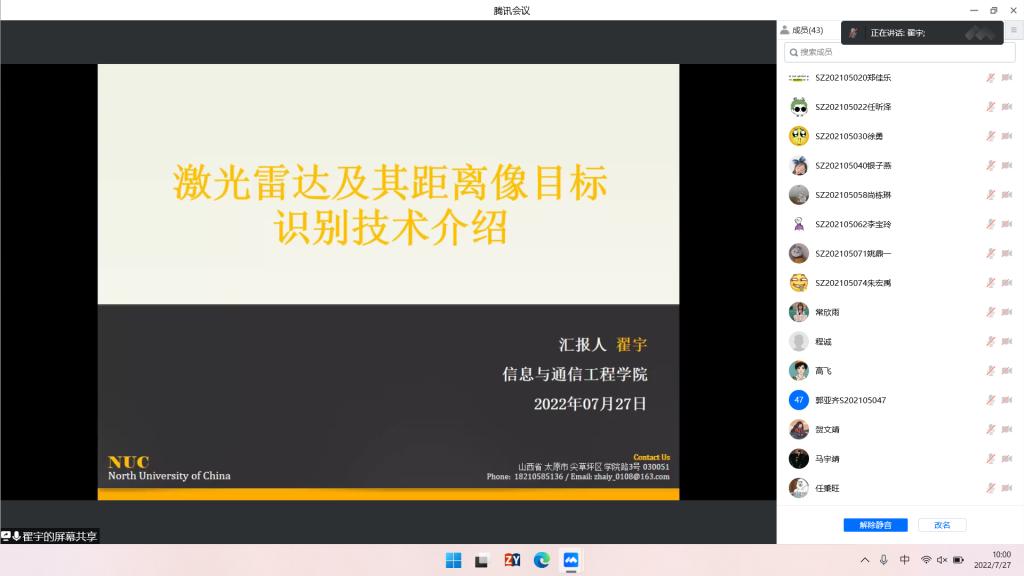 新入职青年教师翟宇以“激光成像雷达及其距离像目标识别技术”为题与全体研一学生展开了相关探讨。