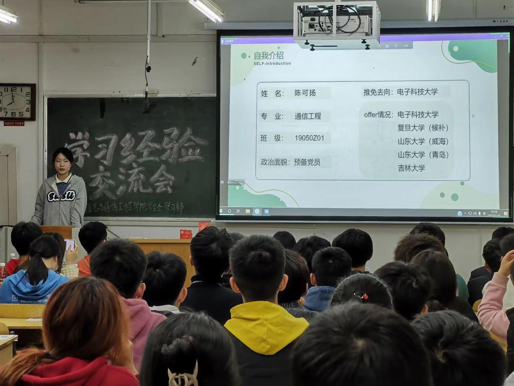 陈可杨学姐推免至电子科技大学。学姐注重学习方面,学分绩点要抓大头,学习能力的培养,合理利用学习资源,还给大家强调了心态,不要焦虑,拥有合适的倾诉者。