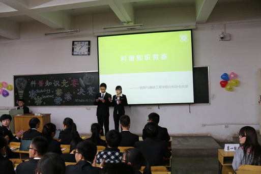 分科协主办的科普知识竞赛决赛于2015年11月8日晚7点在10102H举行。出席本次比赛的嘉宾有校科协副主席王锦云、机电工程学院分科协主席朱豪坤、化工与环境学院分科协主席曹征、理学院分科协主席闫旭东、校科协主席助理赵宸宇、8X8X
