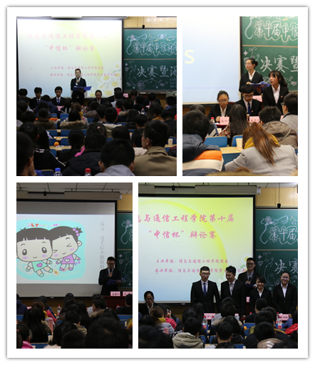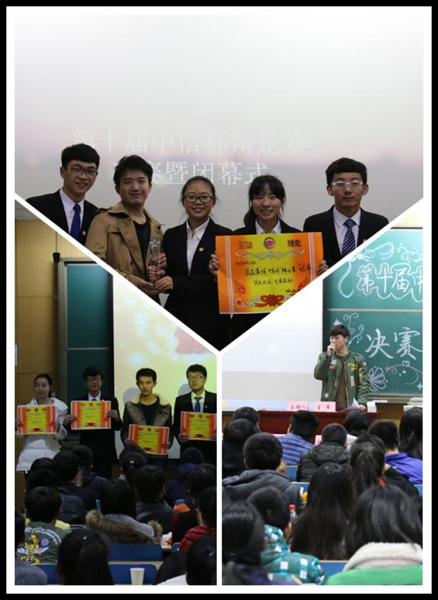 第十届“中信杯”辩论赛于2015年12月5日在11409H迎来了决赛暨闭幕式。两支分别来自15050143班和15050342班的虎狼之师展开了一场激烈的角逐,最终以15050342的胜利圆满结束了第十届“中信杯”辩论赛。本次活动由8X8X