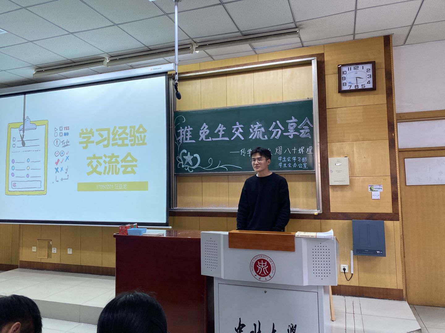 为使大一新生更快适应大学生活,明确自己的学习目标11月28日下午,院在09103H教室召开了以“传学习之火,熠八十辉煌”为主题的第一期学习经验交流会——推免生经验分享会。本次交流会邀请到现已推免至985高校就读的四位学生进行交流,分别是以专业第一的成绩保至华中科技大学攻读博士学位易圣炜、推免至电子科技大学的汪亚龙、保送至厦门大学的陈照艺以及推免至国防科技大学的吕国瑞。