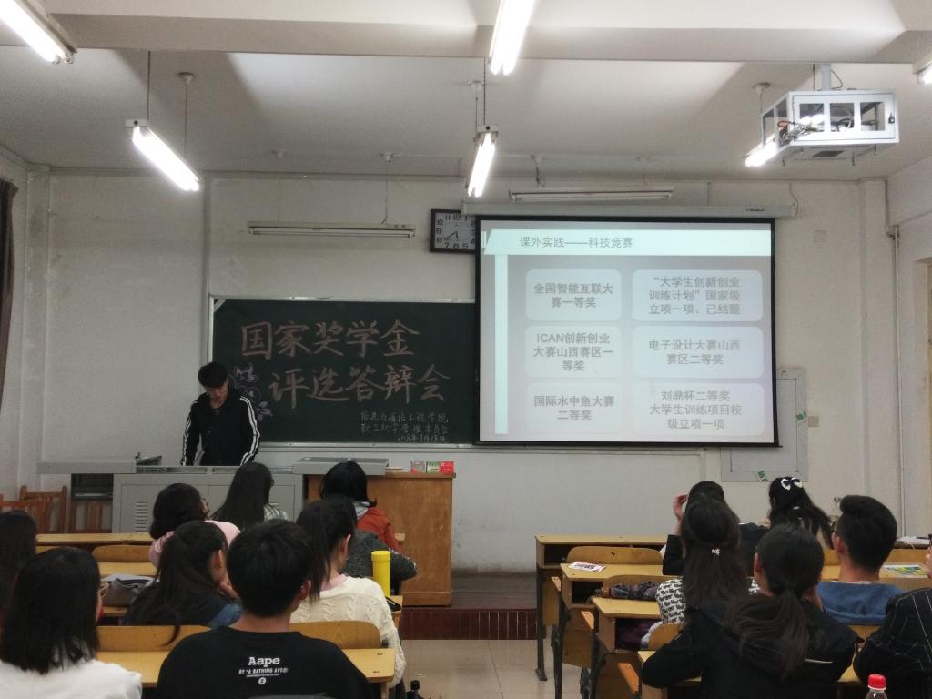 国家奖学金评选答辩会在10209Z教室召开,出席评选答辩会的有学生科负责评奖评优、助学工作的邢杰老师、勤工助学管理委员会的同学代表,以及来自各年级各专业的18名参评同学。