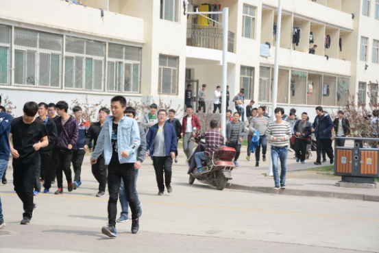 当日中午12:40消防志愿队工作人员就位并准备就绪12:50,随着警报声的响起,五院全体学生纷纷用湿毛巾捂住口鼻,在志愿队成员和楼管阿姨的组织下有序地迅速撤出宿舍,不同年级的同学分别在不同的指定的地点集合。