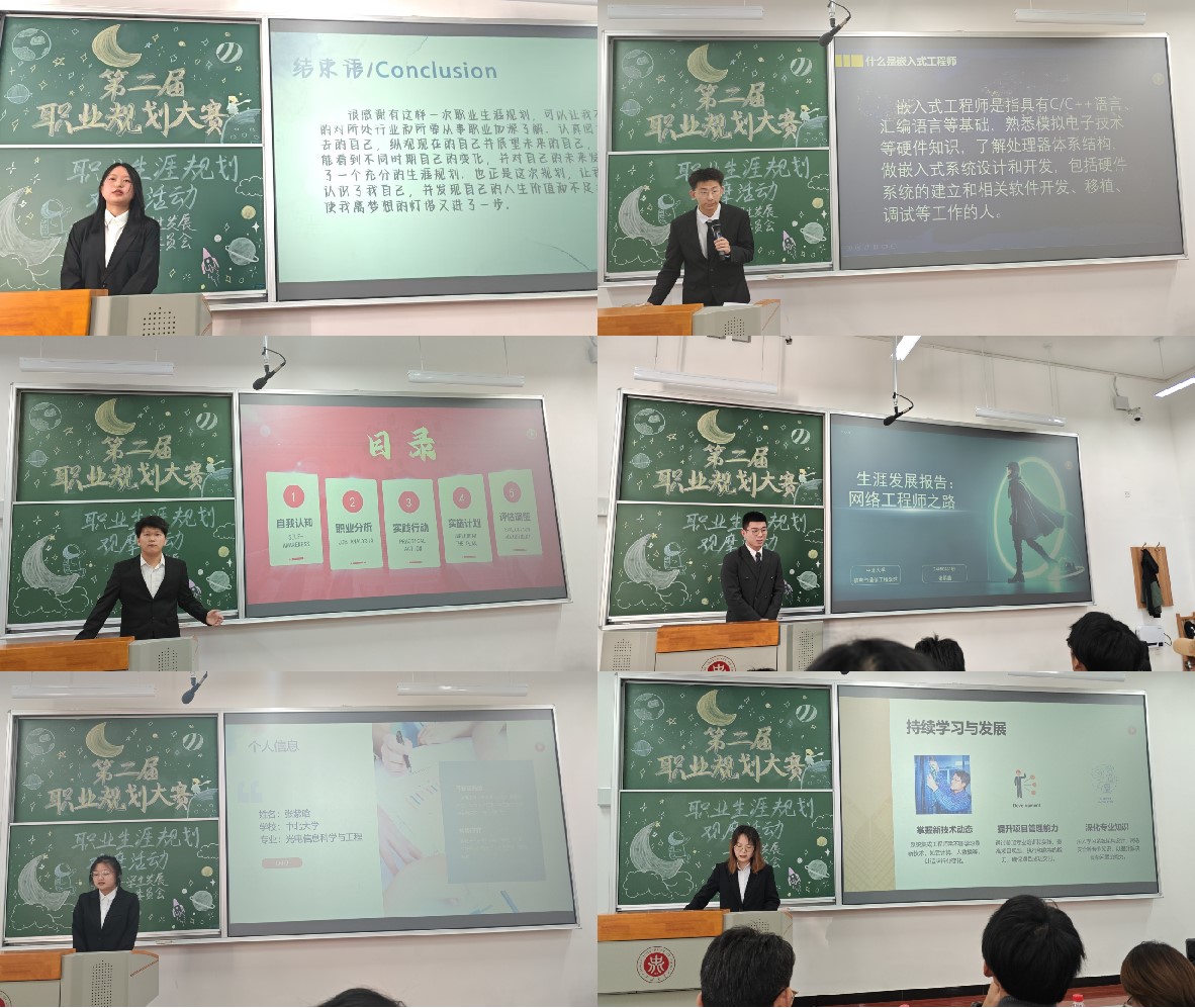 自大赛启动以来,学生们反响热烈,积极参与,经过初赛选拔,共有11位佼佼者脱颖而出,晋级复赛。复赛陈述答辩现场,选手们通过精心制作的PPT,生动直观地展示了自己对未来职业目标的探索与蓝图。他们面向国家需求,基于专业对口行业发展,结合自我认知,深入剖析了行业动态、职业能力需求及个人优势,提出了既具前瞻性又切实可行的职业目标、成长路径及动态调整。有的选手受军旅生涯影响,立志成为信息支援部队的通信兵,为强军梦想添砖加瓦;有的则在大学期间屡获科研竞赛佳绩,对航空航天领域满怀热情,致力于航空报国、逐梦九天;还有的选手融合个人性格特质与专业知识,通过社会实践不断磨砺自我,梦想成为医疗器械行业的销售总监。评委老师们针对每位选手的陈述进行了精彩点评,同时给予了启发性的建议,结合选手陈述向台下观摩的大一新生就职业规划进行了现场讲解和指导。现场观摩的同学们通过本次活动,全面鲜活地了解了职业规划,学习了职业规划基本知识,增强了职业规划意识。