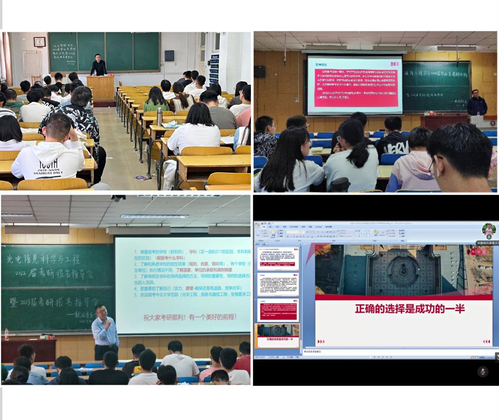2022年升学情况宣介会暨2023年考研报名指导会圆满结束,指导会借鉴“课程思政”思维,按专业细分指导单元,以“第一课堂”“第二课堂”紧密衔接的模式开展。光电科学与工程系主任程耀瑜、人工智能系主任陈平、电子信息工程专业负责人李凯、通信工程专业负责人王晨光、信息对抗专业负责人姚金杰、生物医学专业张鹏程受邀担任主讲嘉宾。