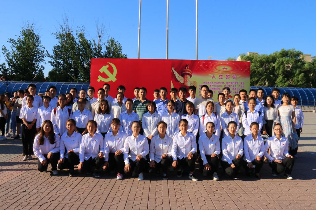 教工支部党员代表和学生支部本学期新发展党员共计70余人,在行知广场参加了8X8X