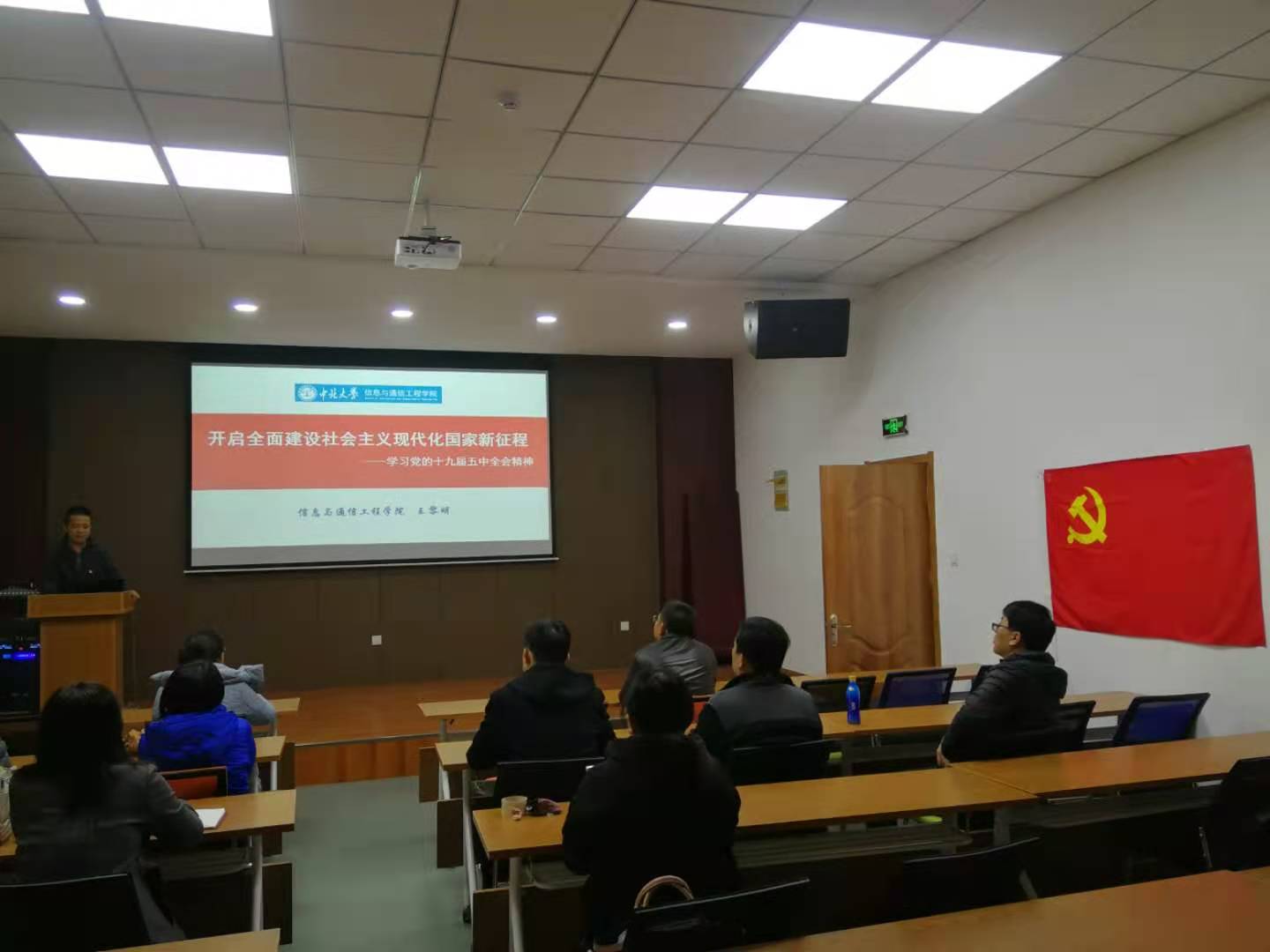 2020年11月18日下午15点,电工电子实验教学中心教工党支部在中心三层会议室召开党的十九届五中全会精神理论学习会,中心主任王黎明进行宣讲,宣讲的主题为“开启全面建设社会主义现代化国家新征程”,支部全体党员参加了学习会