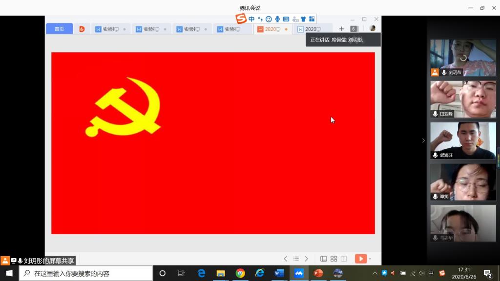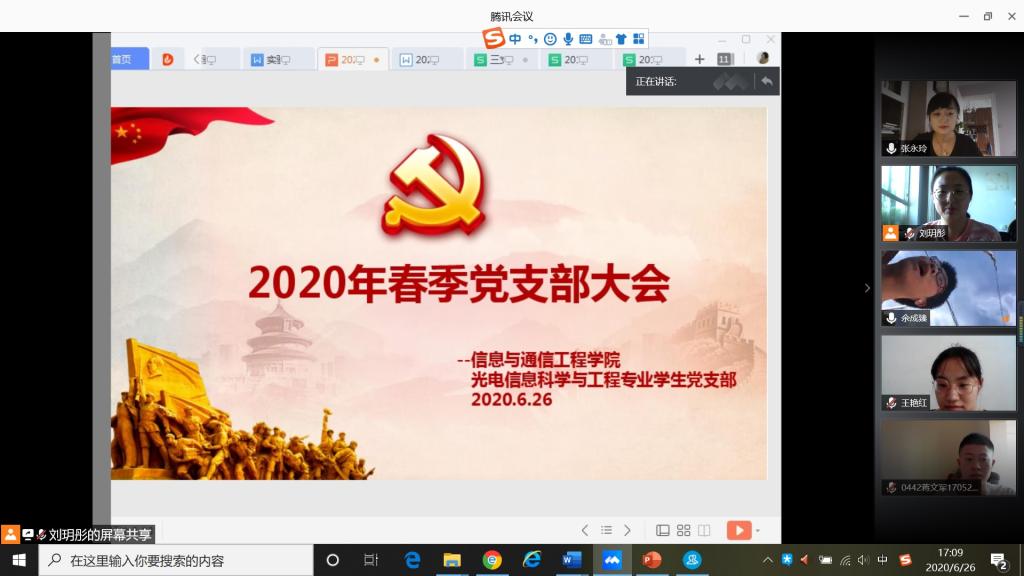 2020626日下午五点,光电信息科学与工程专业学生党支部在腾讯会议平台召开线上党员大会。会议主要讨论关于高虹霞等9位预备党员转正事宜。本次会议由支部书记张永玲老师主持,光电信息科学与工程专业学生党支部全体党员参加会议。