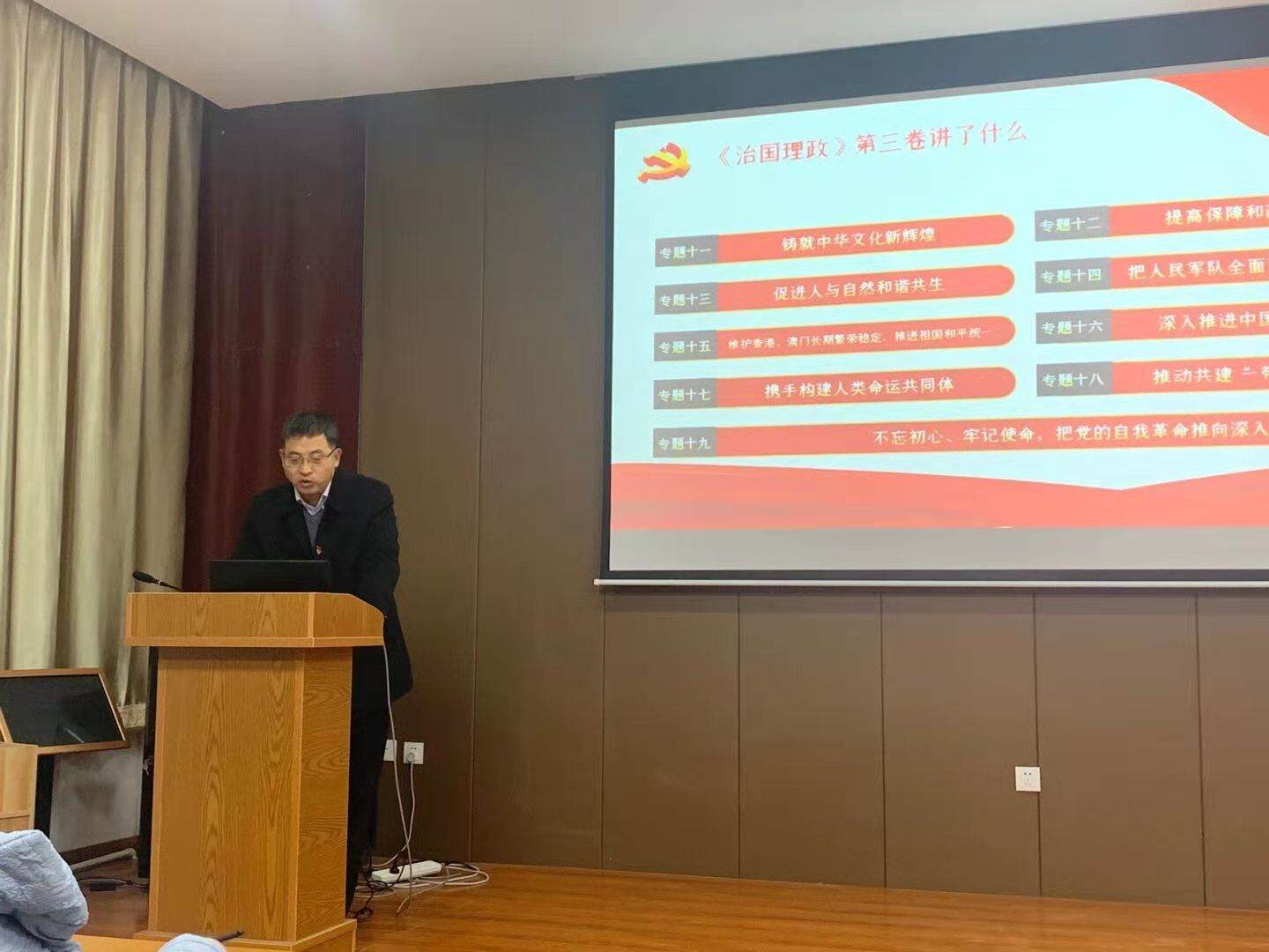 郎文杰老师从“出版《习近平谈治国理政》第三卷的意义”、“《 习近平谈治国理政》第三卷讲了什么”、“《习近平谈治国理政》第三卷该怎么学”三个方面进行了宣讲。郎文杰老师强调各位党员要在知行合一、学以致用上下功夫,真正用党的创新理论武装头脑、指导实践、推动工作,努力克服新冠肺炎疫情带来的不利影响,扎实做好“六稳”工作,全面落实“六保”任务,凝聚起决胜全面建成小康社会、决战脱贫攻坚、乘势而上开启全面建设社会主义现代化国家新征程的磅礴力量。