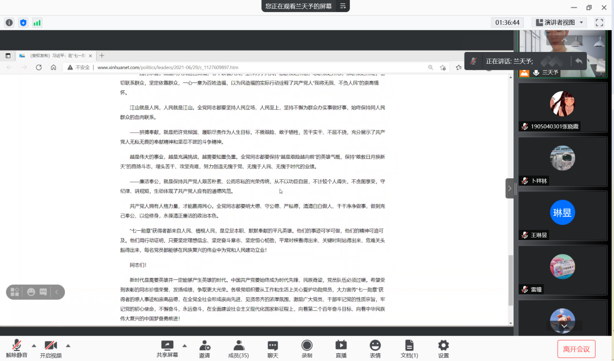 二是学习习近平总书记在“七一勋章”颁授仪式上的讲话精神,并重点学习王红旭同志的光荣事迹。全心全意为人民服务,是我们党的根本宗旨,是一代又一代中国共产党人的不懈追求。在“七一勋章”颁授仪式上,习近平总书记强调:“江山就是人民,人民就是江山。”我们新时代学生党员要谨记总书记教导,以王红旭同志等为榜样,坚定理想信念,立志为祖国和人民贡献力量,创造无愧于时代的一流业绩。