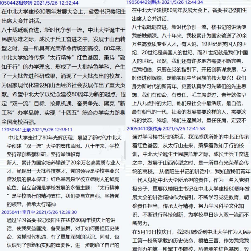 学习完楼书记的讲话,许多支部成员深受触动,大家纷纷在群里发表自己的学习感受,表明自己今后努力的方向和决心,表示今后会继续秉持太行精神,发扬革命传统,为争取母校双一流,为山西的进一步发展添砖加瓦,贡献自己的力量。