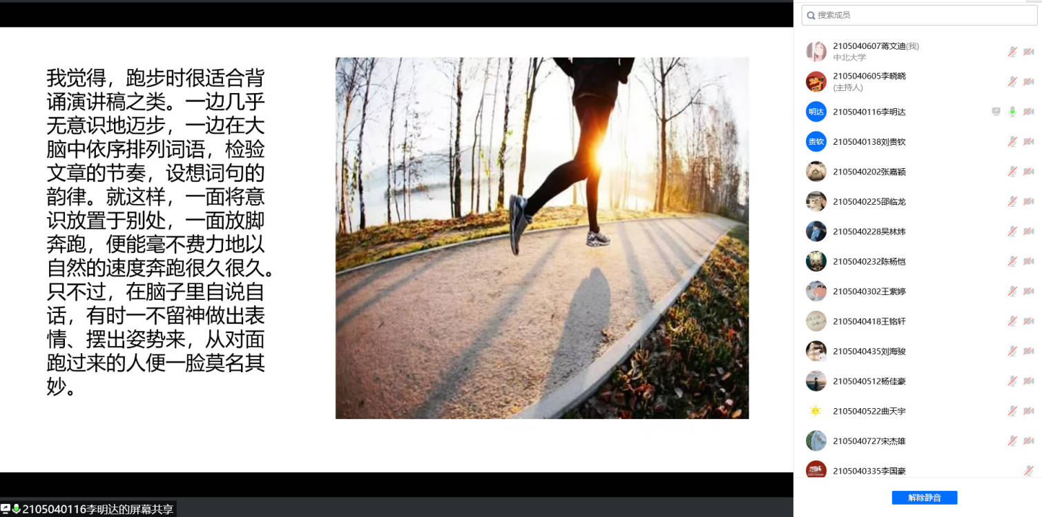 随后支部成员就自己所读的书进行了介绍和分享。从王树增的《长征》中,我们领略到了长征途中的困苦险阻、艰难跋涉,也领略到了那些年的革命斗士奋勇抗战,不怕牺牲的抗争精神;从村上春树的《当我谈跑步时我谈些什么》中,我们感受到了一个知名作家,在运动中所得到的恬然和自得,正如村上春树在书中所写的:“成绩也好,名次也好,外观也好,别人如何评价也好,都不过是次要的问题。对于我这样的跑者,第一重要的是用双脚实实在在地跑过一个个终点,让自己无怨无悔。”;而从路遥的《平凡的世界》中,我们感受到了十年之间,普通人在狭缝中艰难求生的故事,也体会到了“于时代潮流中奋勇向前”的奋进精神。