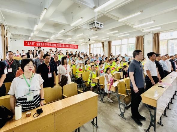 在隆重的国歌声中,曹凤才书记代表中北大学致欢迎辞,他指出:“探索浩瀚宇宙、发展航天事业、建设航天强国就是每位中国人的梦想,北斗杯大赛落地中北大学,不仅延续了人民兵工第一校的国防特色,也为学校推进科普教育、传播北斗科技和文化提供了重要支撑平台”;参赛队员代表、专家裁判代表、监督委员会代表相继上台宣誓,最后,山西省青少年事业发展中心张华主任宣布第十五届“北斗杯”全国青少年空天科技体验与创新大赛山西赛区选拔赛比赛正式开幕。
