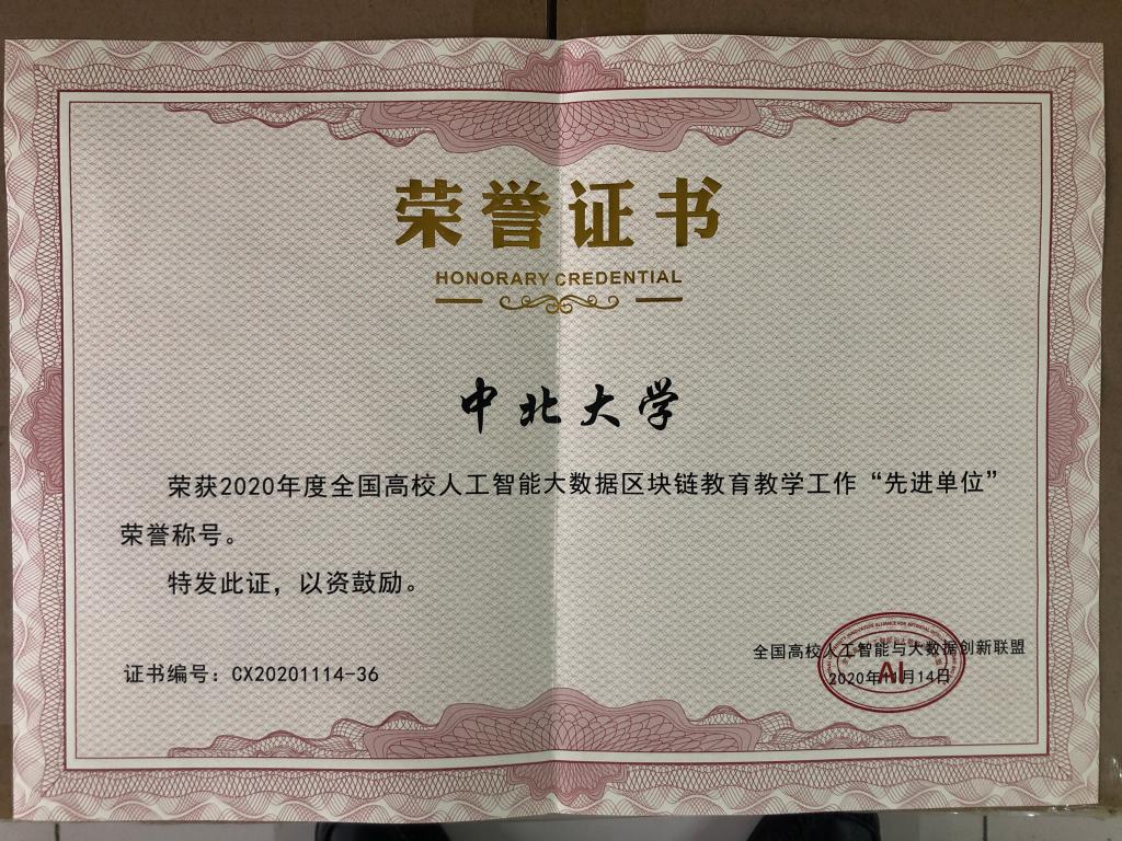 2020年11月14日,由全国高校人工智能与大数据创新联盟主办、中北大学、云南大学、电子科技大学等13家单位和机构协办的“2020第三届全国高校人工智能大数据区块链创新论坛”在北京隆重召开。论坛上,颁发了人工智能创新高校奖、2020人物创新奖、教育教学先进单位奖等奖项。中北大学荣获“2020年度全国高校人工智能大数据区块链教育教学工作先进单位”。