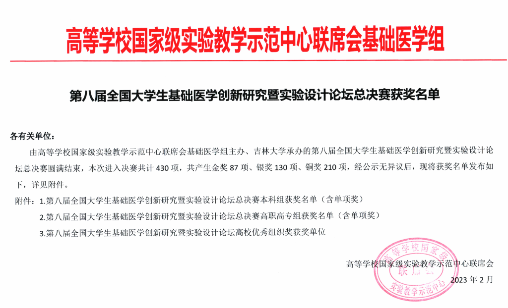 该论坛由高等学校国家级实验教学示范中心联席会主办,大赛学科组除传统的基础临床组外,首次开设预防医学、法医学、中医药学3个赛道,旨在推进基础与临床结合、中西医结合、预防医学、法医学的基础研究和技术的融合创新以及医工交叉等融合创新。作为中国基础医学领域最高级别的学生学科竞赛之一,赛事以“崇尚科学、追求真知、勇于创新、公平公正”为宗旨,不仅考验学生创新能力和实验技能,更考验新医科建设背景下教师指导能力。在西部、北部、东部、中南部四大赛区复赛评比中获得一等奖与二等奖的作品入围决赛,共计有全国三十余个省份140余所高校、429支参赛团队的2000余名师生参加,角逐金奖(20%)、银奖(30%)、铜奖(50%)以及单项奖。