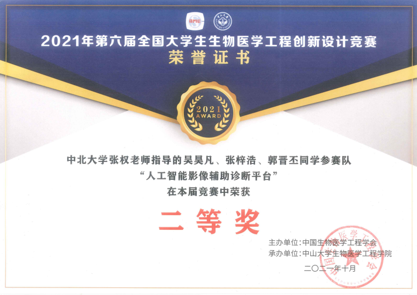 2021年10月31日,在第六届全国大学生生物医学工程创新设计竞赛决赛中,我专业创新团队(指导教师:张权,参赛本科生:吴昊凡、张梓浩、郭晋丕),凭借他们构思设计的《人工智能影像诊断辅助平台》获得了命题组人工智能类的全国二等奖。