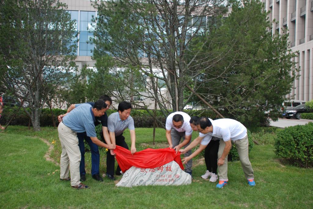 此次聚会,71941班还为母校捐赠了一棵白皮松、一块纪念石,雷锋斌副校长、韩焱教授、杨风暴院长和71941班代表于洋、李蓓、李建中共同参加了揭牌仪式。