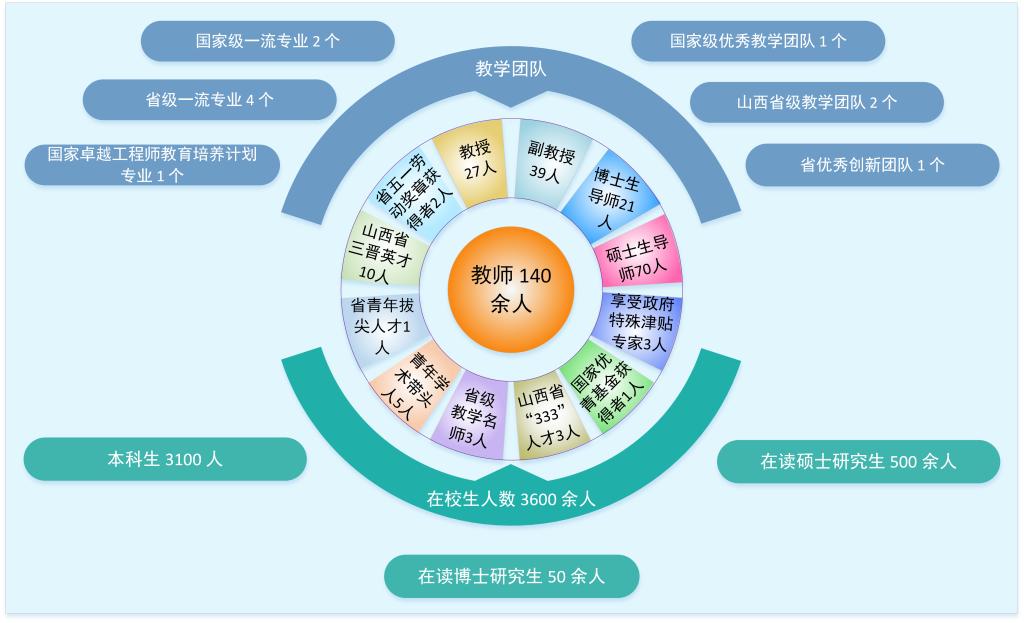 学院师资力量雄厚,现有教职工140余人,其中兼职工程院院士1人,教授27人,副教授39人;博士生导师21人,硕士生导师70人。享受政府特殊津贴专家3人、国家优秀青年科学基金获得者1人,山西省级教学名师3人、山西省研究生优秀导师3人,山西省“333”人才3人、山西省中青年拔尖创新人才1人、山西省青年拔尖人才1人、山西省青年学术带头人3名、山西省三晋英才获得者10人、山西省五一劳动奖章获得者2人、山西省教授协会科教兴晋突出贡献专家2人、山西省教授协会师德楷模4人、山西省教授协会高校教学名师1人。学院拥有国家级优秀教学团队1个、省级教学团队2个、省优秀创新团队1个。