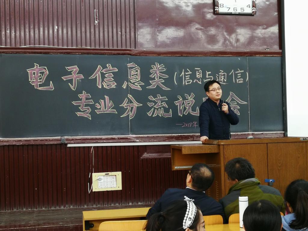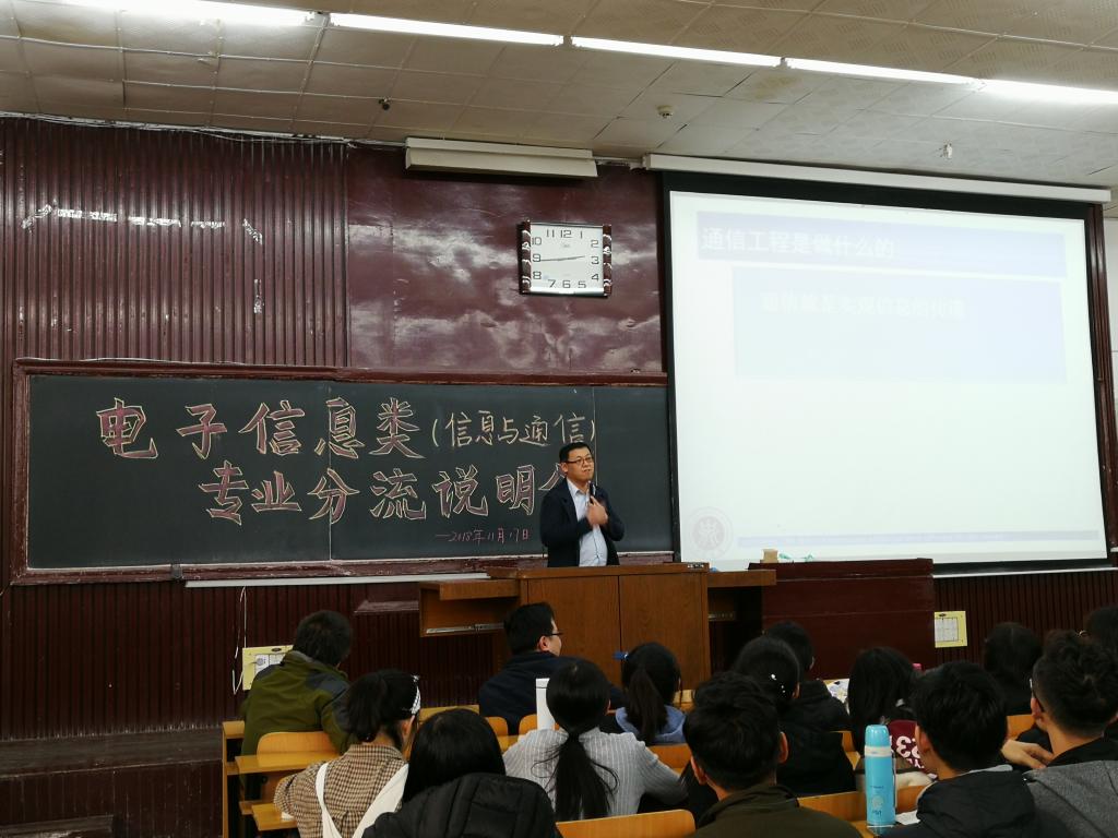 2018年11月17日下午2点30分,8X8X 2017级电子信息类(信息与通信)专业分流说明会在07103H教室顺利举行。8X8X 学科管理部副主任电子信息工程专业负责人王浩全,通信工程专业负责人王晨光,信息工程专业负责人陈平出席了此次会议,学院2017级电子信息类(信息与通信)全体学生参加了说明会。